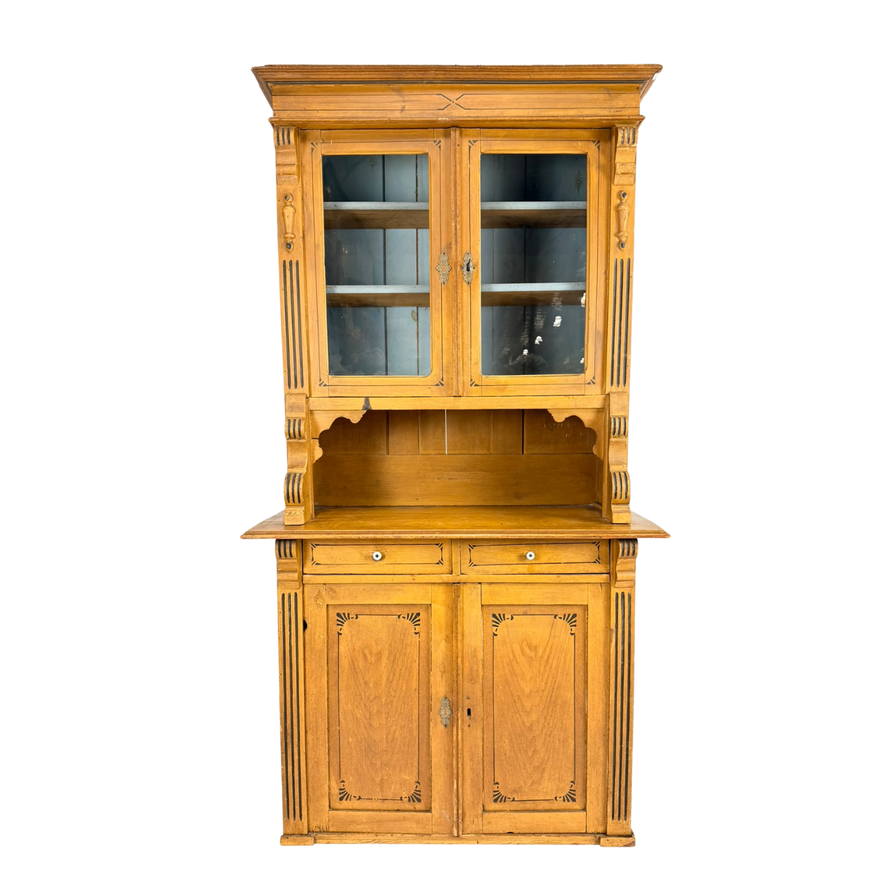 This beautiful 19th century honey pine step back hutch carries the charm of early farmhouse craftsmanship. The upper glass doors are ideal for displaying china, while the open center shelf and lower cabinet provide practical storage. Carved accents, original hardware, and its warm honey toned finish give the piece a timeless country presence. And its classic step back silhouette enriches any room with quiet, authentic character.