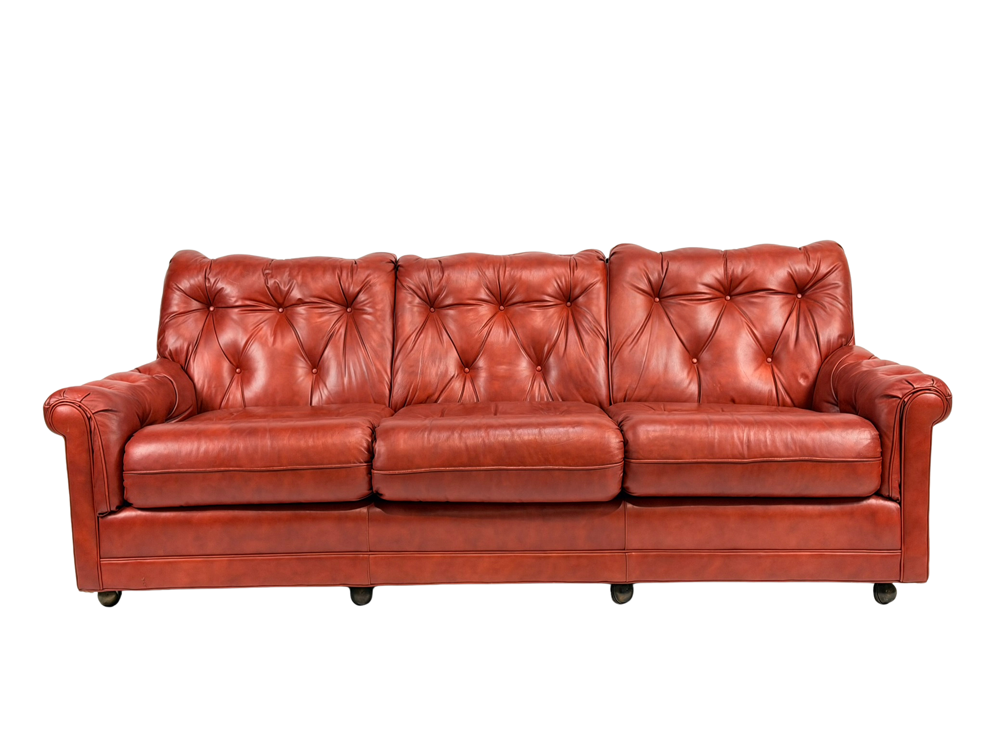 This is a beautiful red leather sofa by Classic Leather, crafted in rich top-grain leather that brings warmth and refinement to any living space. The deep tufting across the back adds a sculpted elegance while the three generously cushioned seats create an inviting, lounge-worthy feel. And the rolled arms give the entire silhouette a timeless traditional appeal. It is a piece made for comfort with a look that instantly elevates a room.