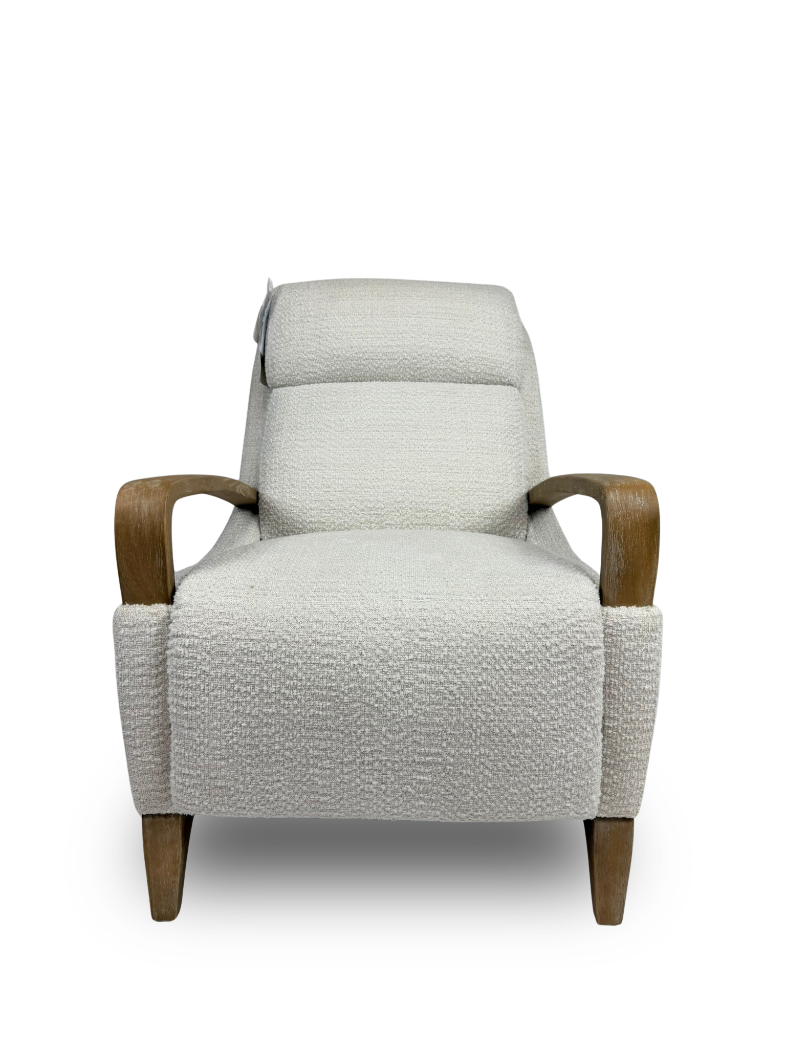 This is a refined modern pushback recliner that balances comfort with a clean, architectural presence. Upholstered in an ivory textured fabric, the chair feels soft and inviting while maintaining a tailored, contemporary look. The gently curved solid wood arms and tapered wood legs add warmth and a natural contrast, giving the piece an elevated yet relaxed character. And the fully cushioned seat and back provide generous support, while the smooth pushback reclining mechanism allows for effortless lounging.