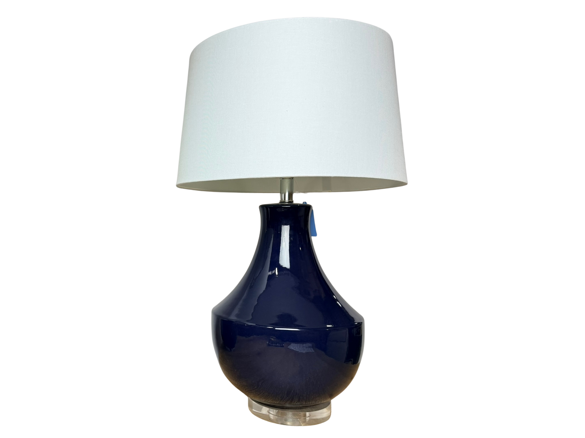 This refined table lamp pairs classic ceramic craftsmanship with a clean, contemporary silhouette. The gently rounded ceramic base is finished in a deep, lustrous blue, offering a rich sense of depth and understated elegance. Its softly tapered form feels balanced and sculptural, while the crisp white drum shade introduces contrast and lightness.