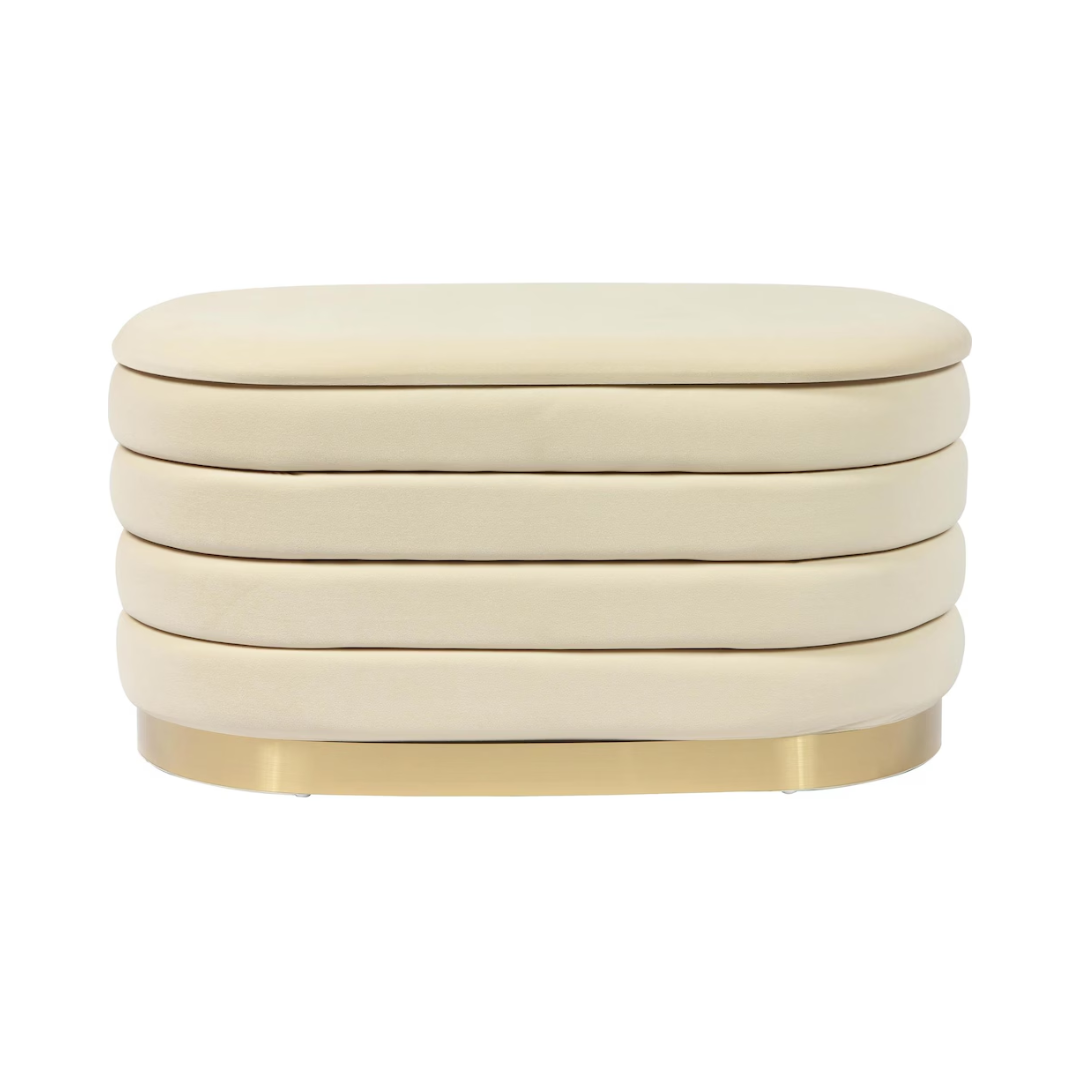 This is a stylish storage bench upholstered in plush velvet with a sleek gold-finished base that adds refined glamour. The channel-tufted design brings texture and depth while the hidden internal compartment offers practical storage. Works beautifullyat the foot of a bed in an entryway or tucked alongside seating in a living area.
