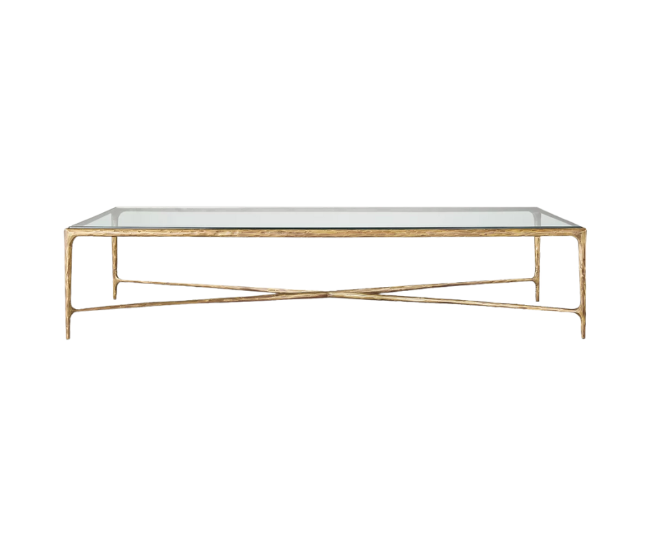 This elegant Thaddeus coffee table from Restoration Hardware showcases exceptional craftsmanship with a hand-forged solid brass base and a sleek clear glass top. The sculpted cross-brace design offers both structure and lightness, while the subtle texture of the brass lends a warm, organic sophistication. Its clean geometry and transparent top make it a versatile centerpiece that suits modern, transitional, and classic interiors alike.